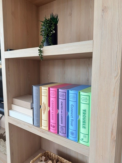 Game night but aesthetic 🎲! I found the cutest way to keep games out without the clutter… this vintage-style book game literally blends into my shelf like decor. But inside, it’s a full game setup—perfect for quick family nights or when we have people over.