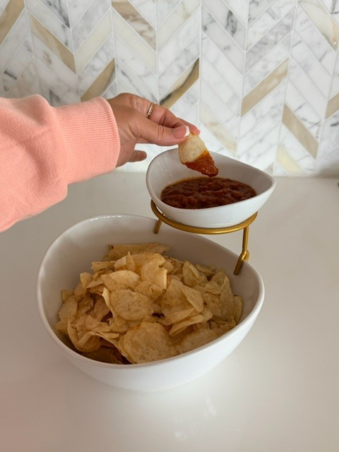 Serve snacks in style! Whether you are hosting or just snacking, this this chip & dip + taco rack setup is perfect for serving all your favorites in the prettiest way. Plus, the gold stand gives it that elevated look that works for parties, game nights, taco bars, and family dinners. Even better, it’s super easy to set up, display, and refill. So entertaining becomes effortless and stylish.